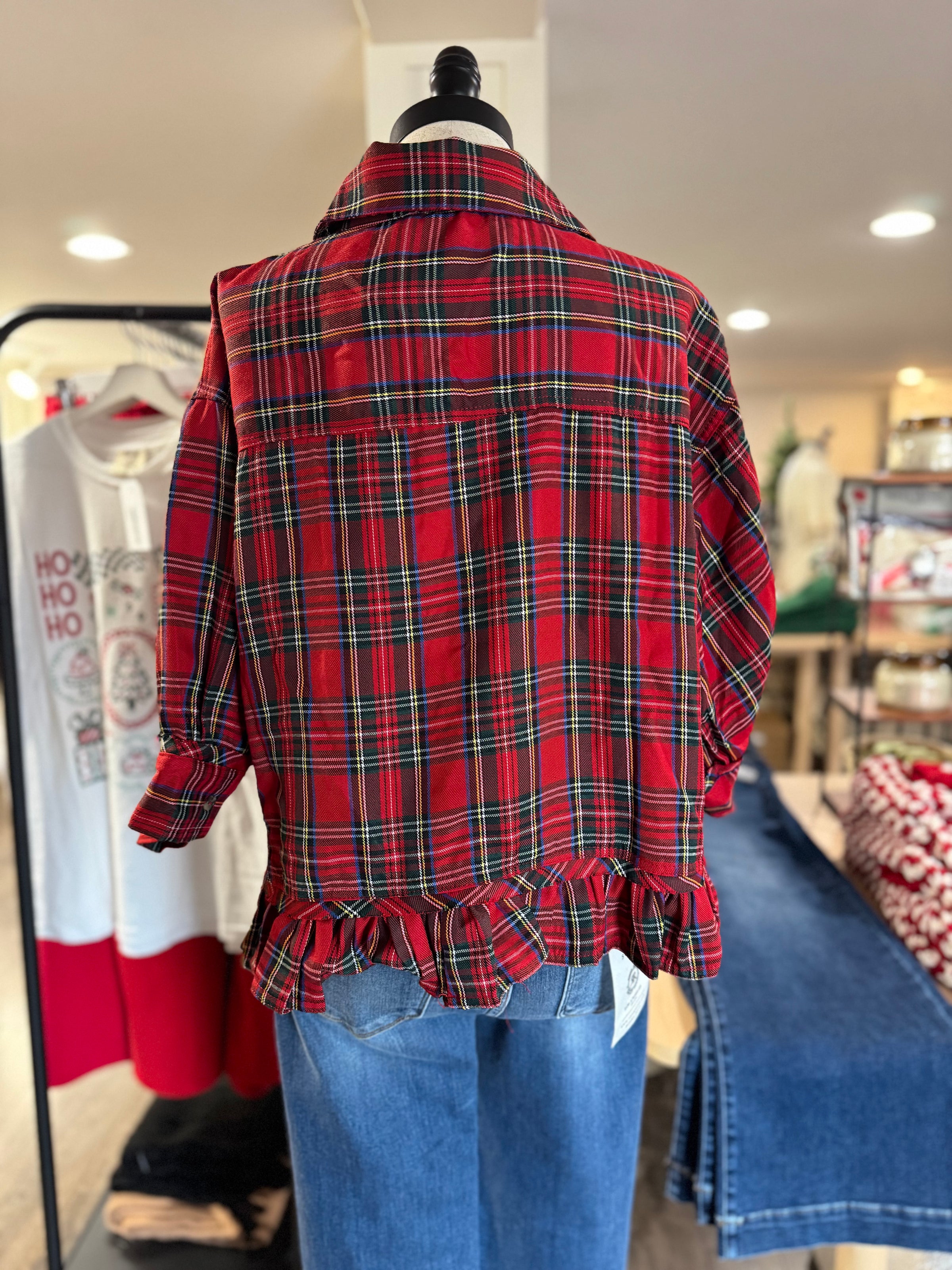 Elevate your wardrobe with this playful plaid peplum blouse that brings serious style to your everyday rotation. Featuring a classic button-front design and crisp collar, this piece offers timeless appeal with a modern twist. The relaxed fit ensures all-day comfort, while the ruffled peplum waist adds a flirty, fashion-forward touch that instantly elevates any outfit. Perfect for dressing up or down, this red tartan beauty is your new go-to for effortless chic vibes.