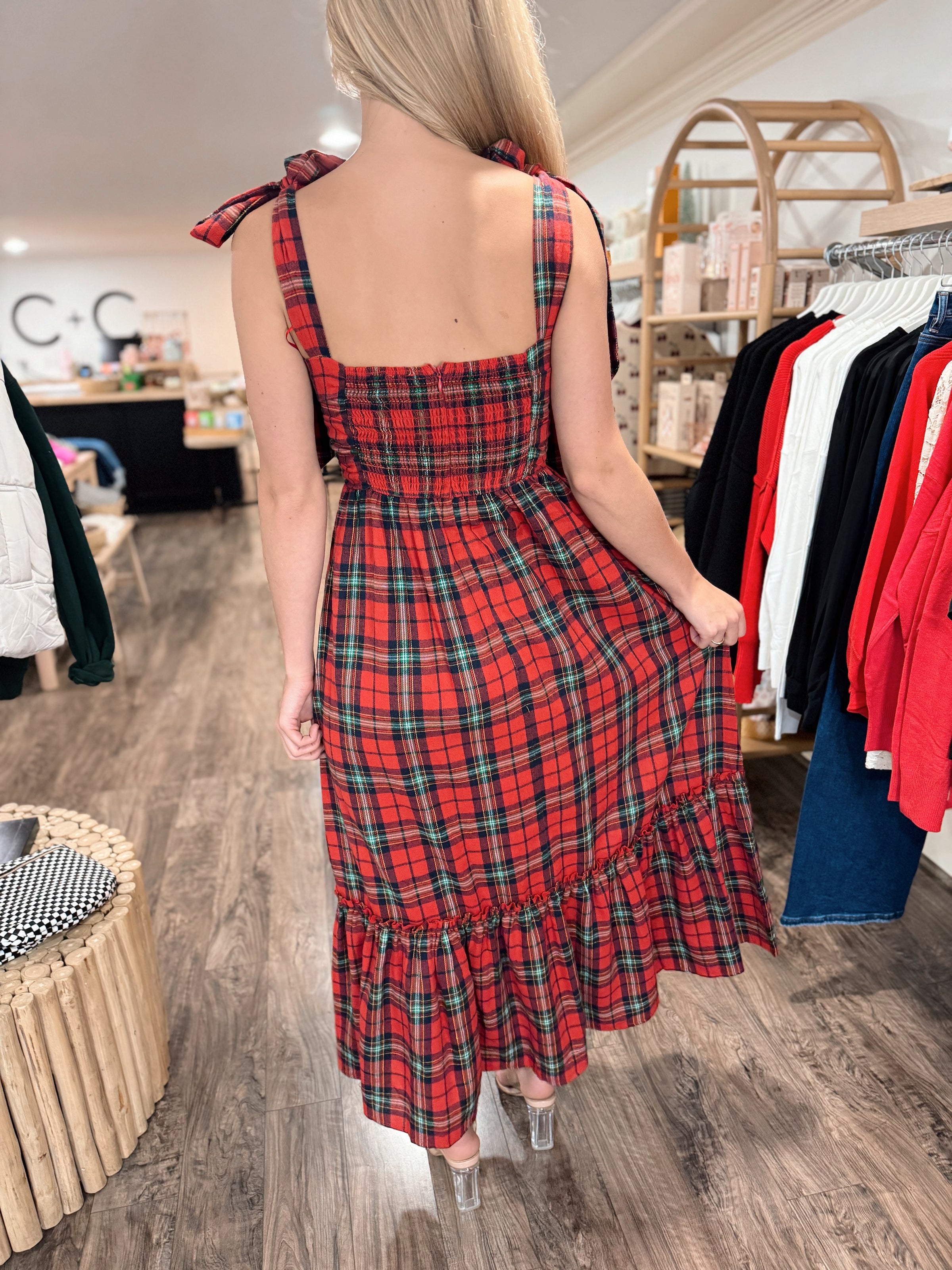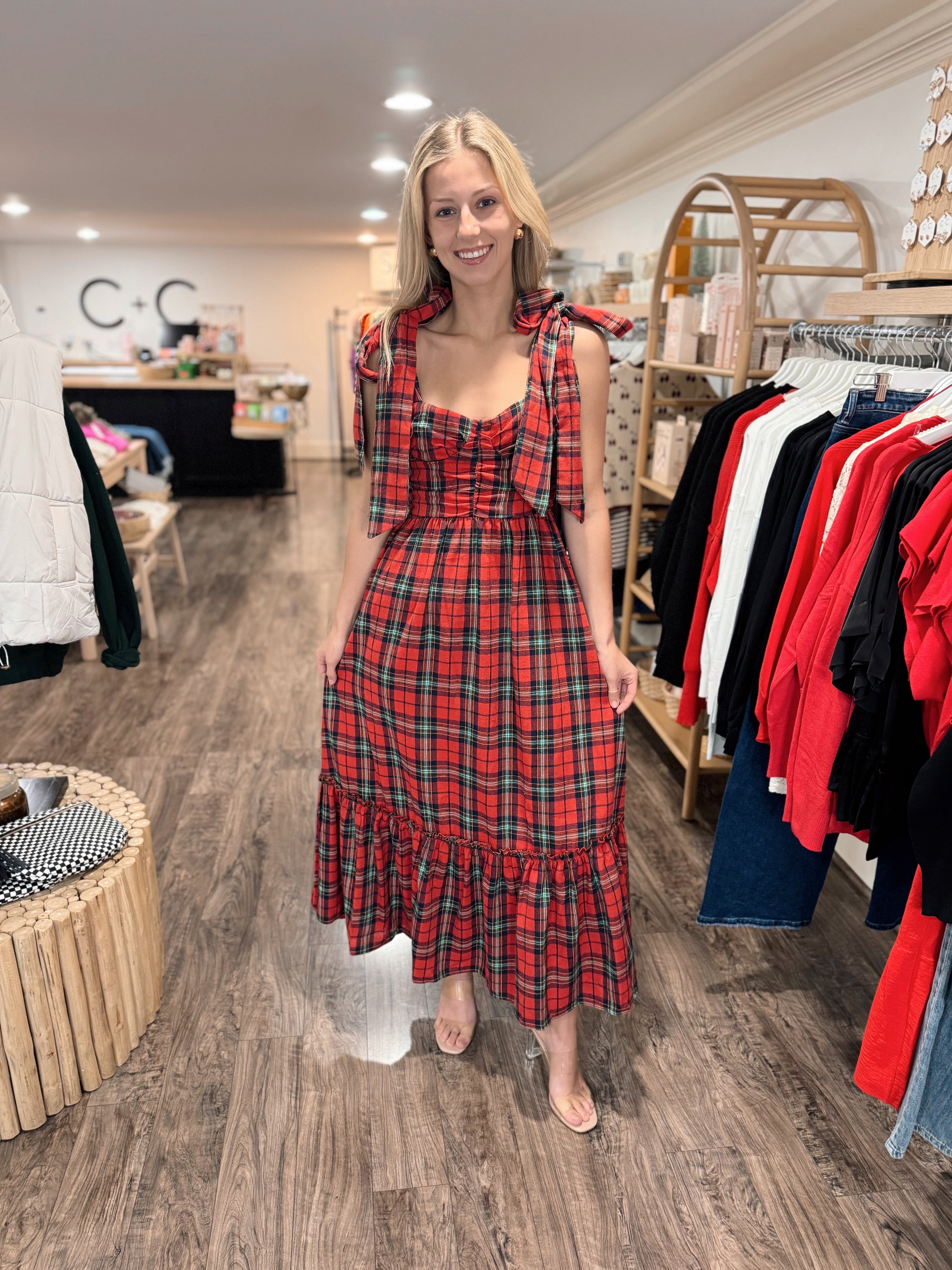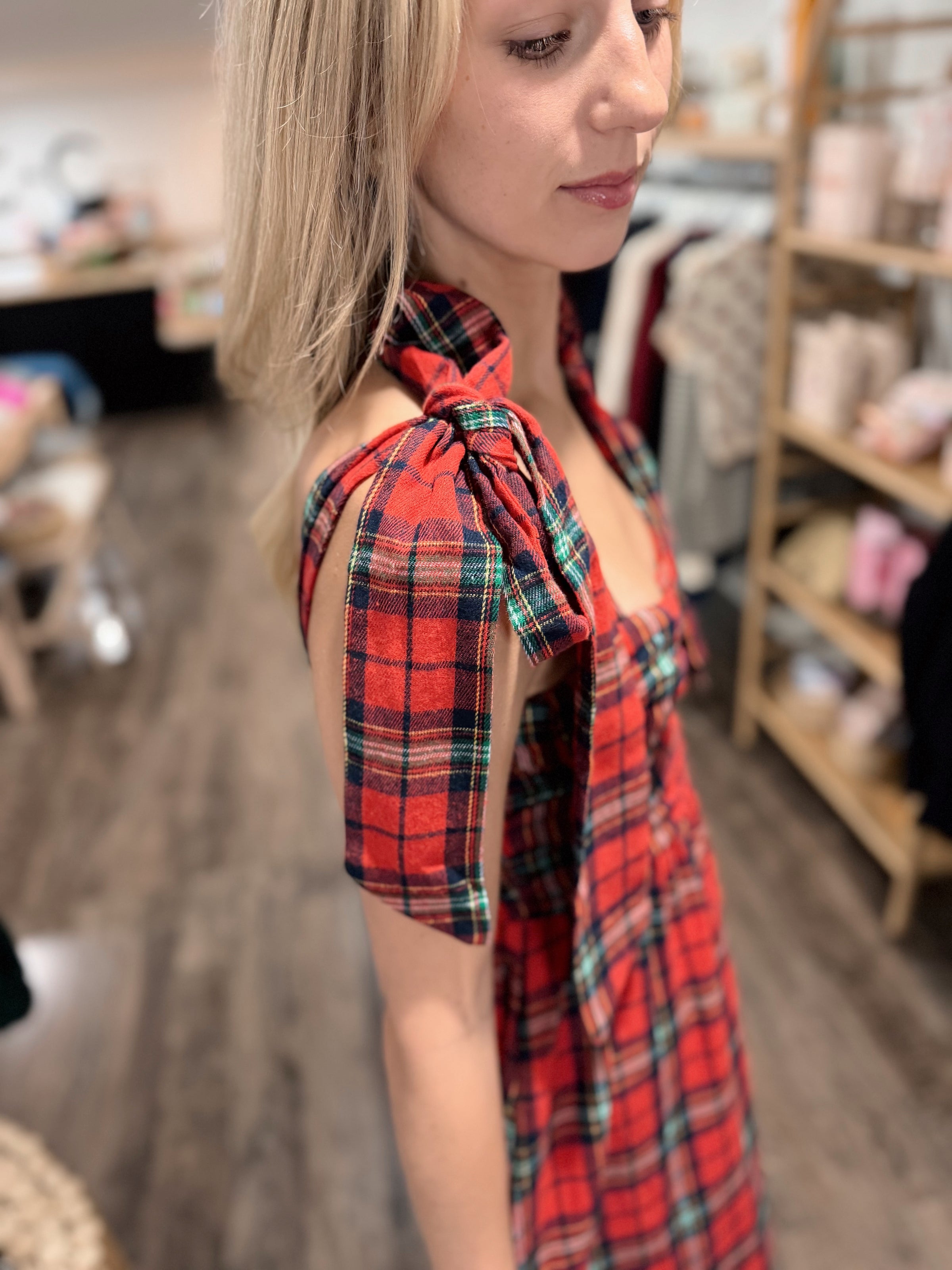 Wrap yourself in festive charm with this stunning Christmas check plaid midi dress. Featuring a timeless red and green tartan pattern, this woven piece captures holiday spirit with effortless elegance. The delicate ribbon straps add a feminine touch, while the midi length offers versatile styling for seasonal celebrations and beyond. Perfect for holiday parties, family gatherings, or festive brunches, this dress combines classic plaid tradition with modern flair. Dress it up with heels or keep it casual with sneakers—either way, you'll radiate seasonal joy.