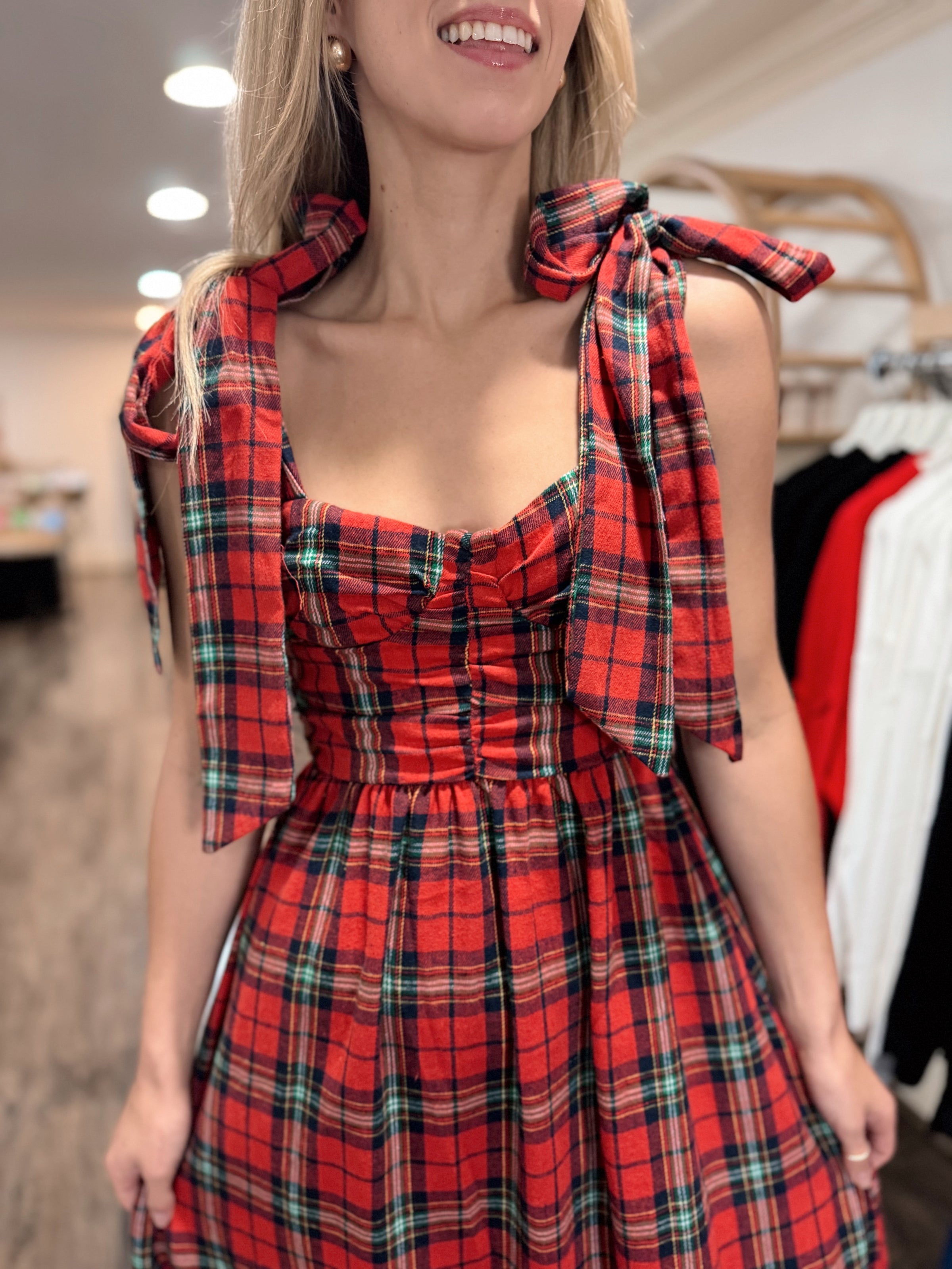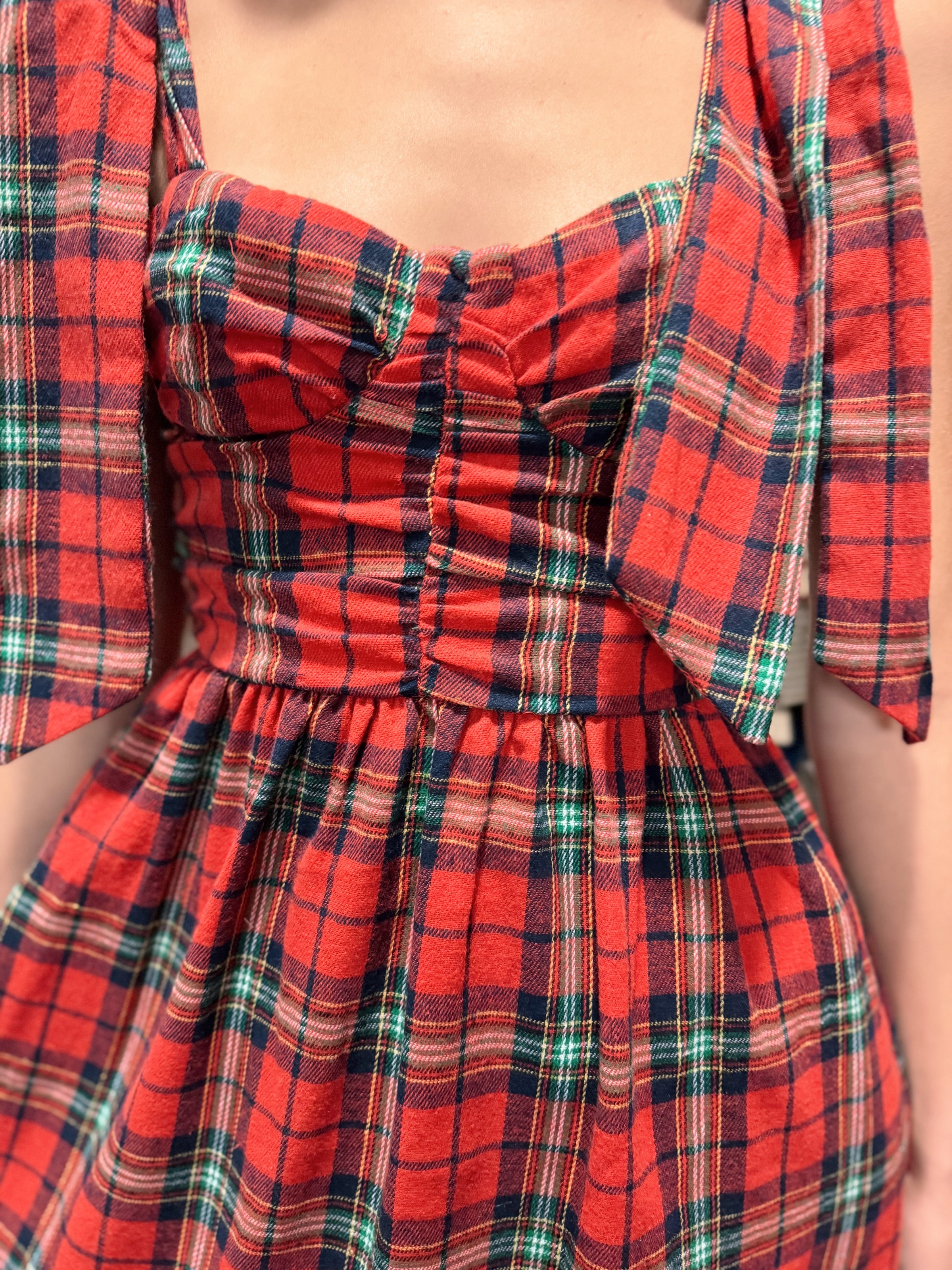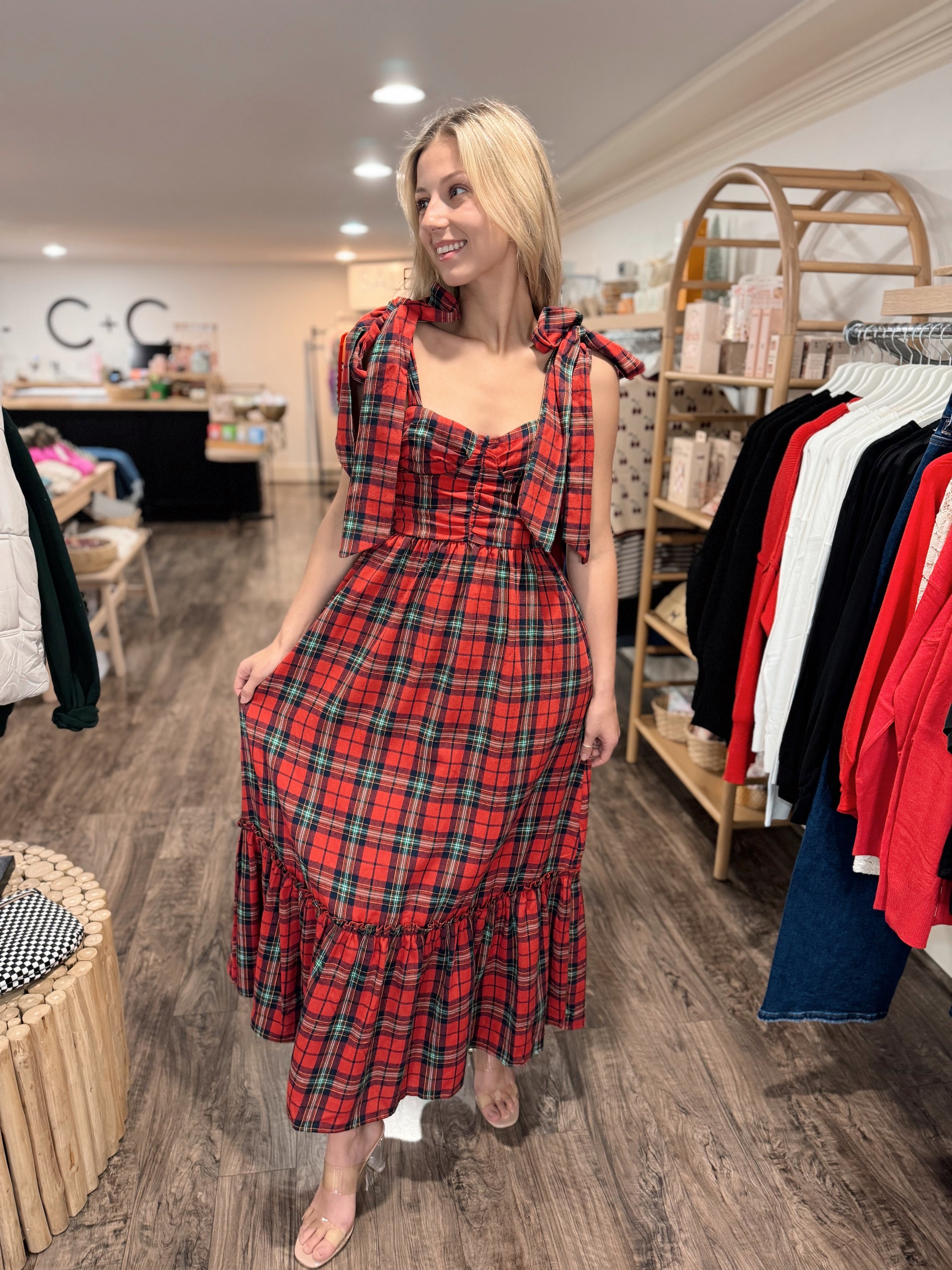 Wrap yourself in festive charm with this stunning Christmas check plaid midi dress. Featuring a timeless red and green tartan pattern, this woven piece captures holiday spirit with effortless elegance. The delicate ribbon straps add a feminine touch, while the midi length offers versatile styling for seasonal celebrations and beyond. Perfect for holiday parties, family gatherings, or festive brunches, this dress combines classic plaid tradition with modern flair. Dress it up with heels or keep it casual with sneakers—either way, you'll radiate seasonal joy.