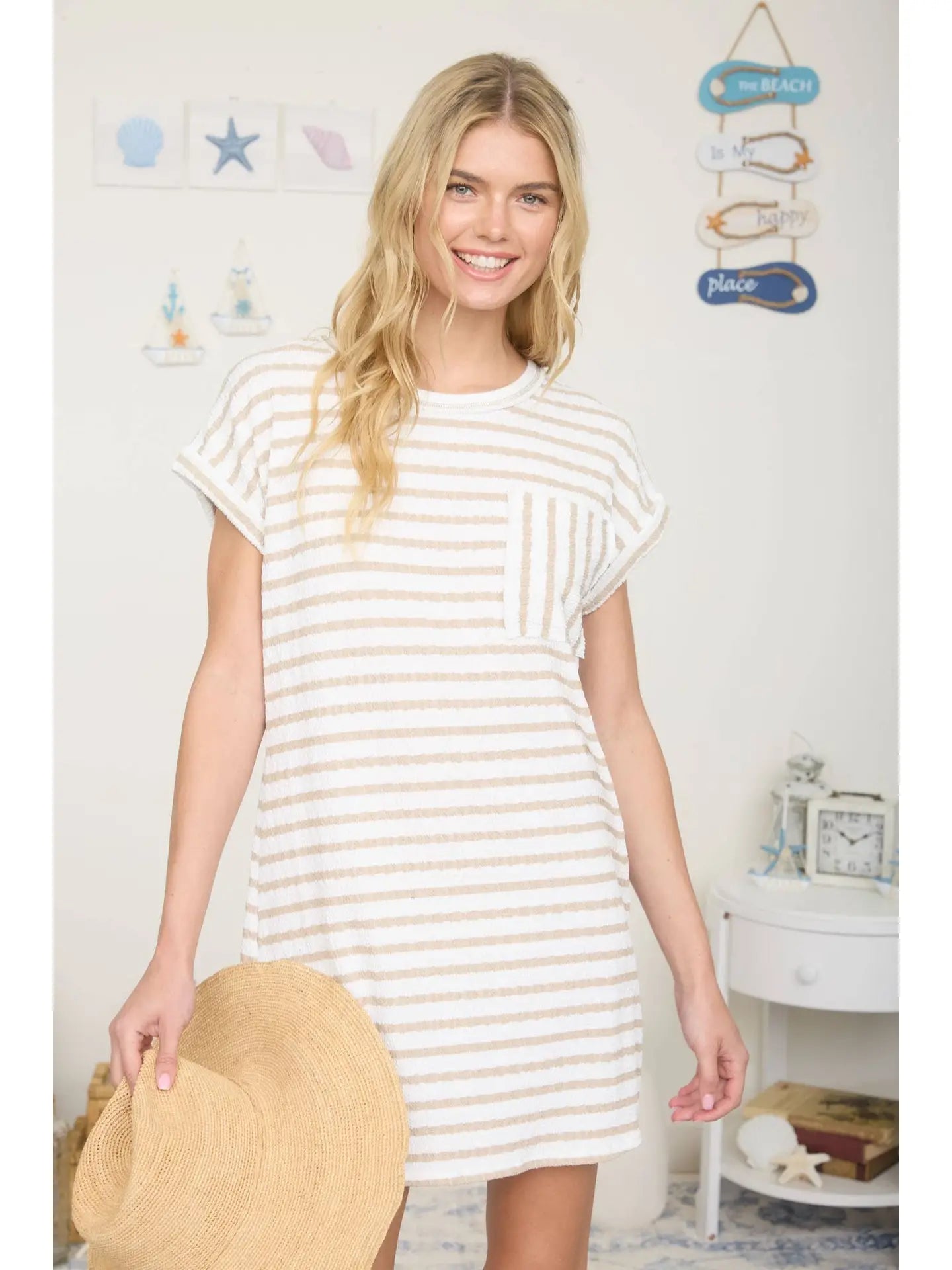 Effortless style meets comfort in this relaxed-fit mini t-shirt dress. Crafted from a soft polyester and spandex blend, it features a textured stripe knit pattern that adds visual interest to your everyday look. The rounded neckline, cuffed sleeves, and functional pocket make it both practical and chic. Perfect for casual outings, this versatile khaki dress transitions seamlessly from day to night.