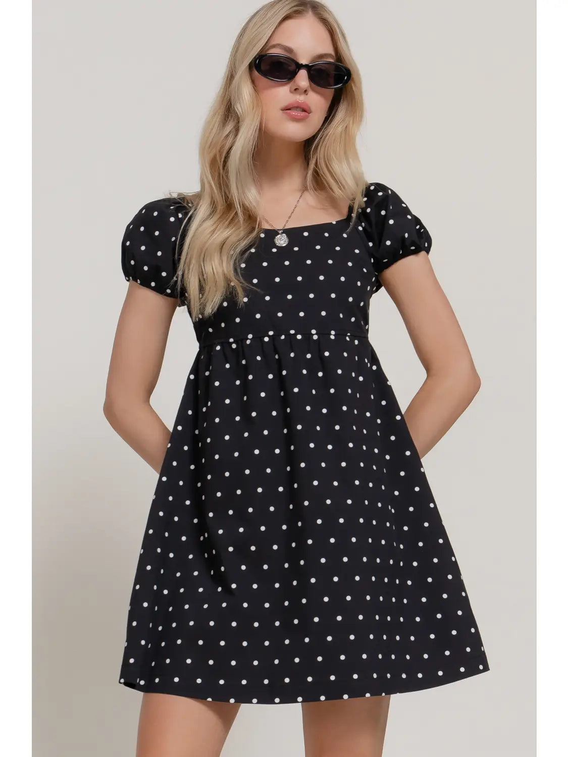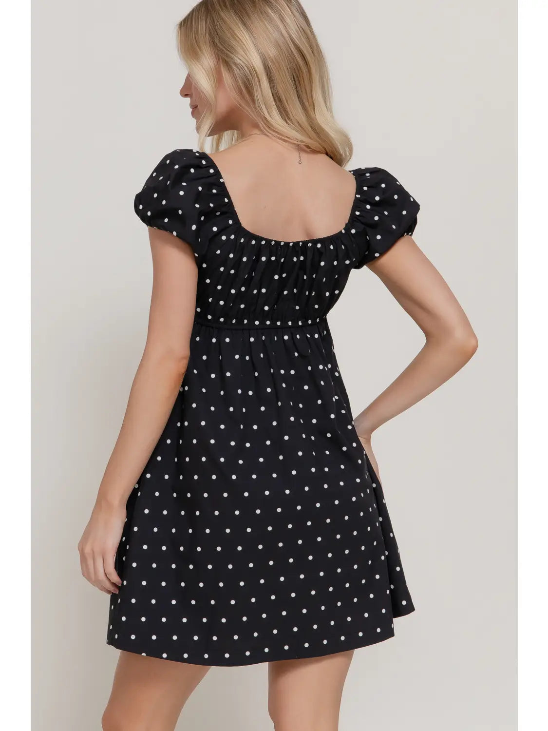 Elevate your everyday style with this playful mini dress featuring charming puff sleeves and a flattering A-line silhouette. The straight neckline keeps things classic while the all-over dot print adds a whimsical touch. Crafted from a breathable cotton-blend fabric with just enough stretch for comfort, this voluminous design moves beautifully and works perfectly for casual outings or weekend adventures. A versatile piece that brings effortless fun to any wardrobe.