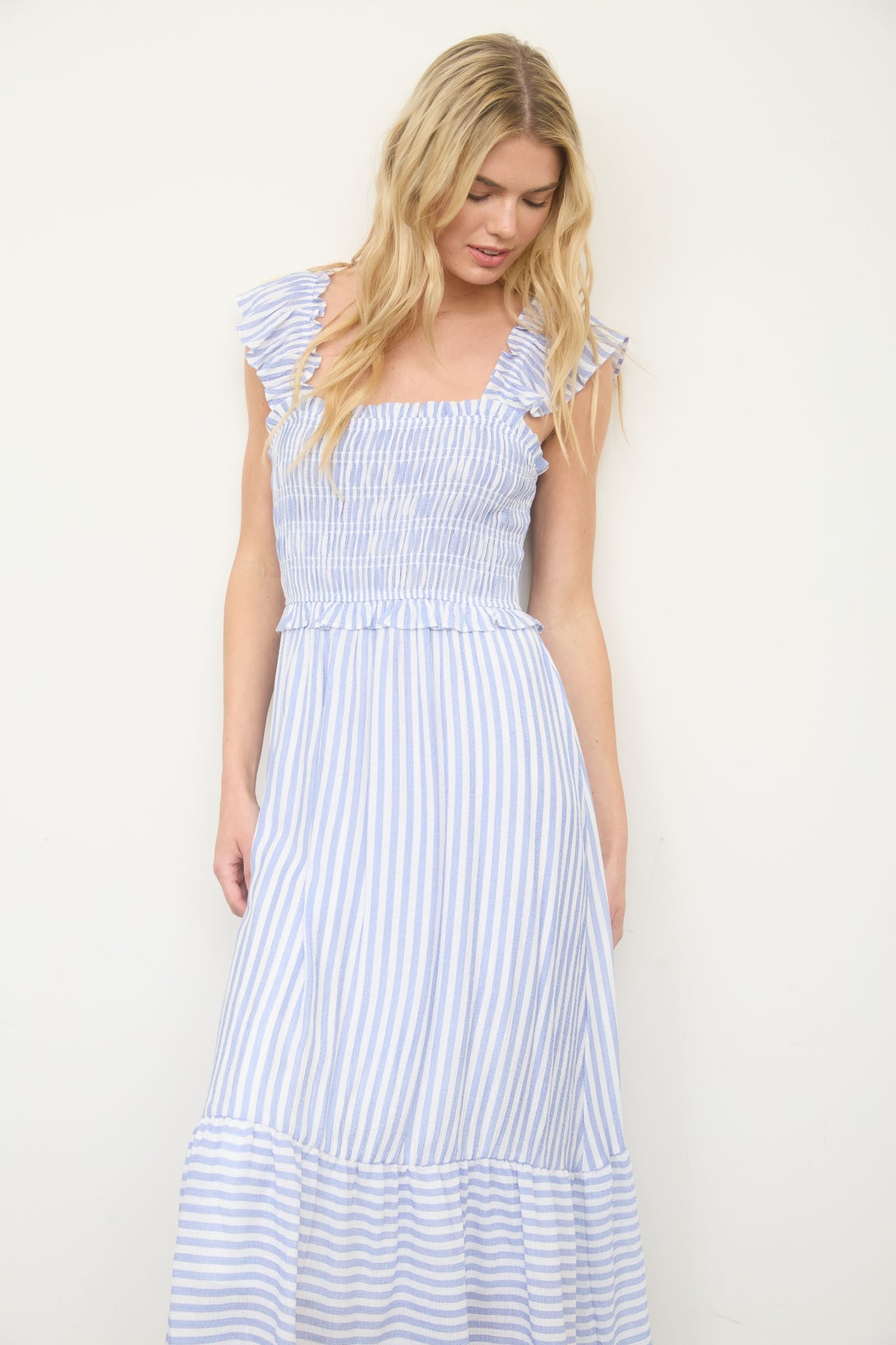 Sail into style with this charming striped midi dress. Featuring a square neckline, sleeveless cut, and smocked bodice for a flattering fit, it's adorned with delicate ruffle details on the straps, trim, and hem. The classic stripe pattern adds nautical appeal, while the lined construction ensures comfort and coverage. Perfect for casual outings or dressed-up occasions.