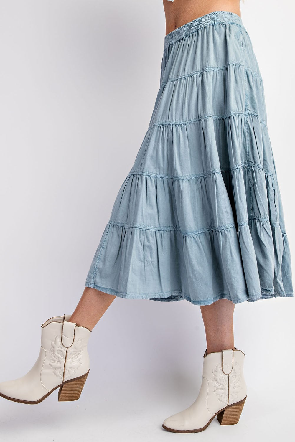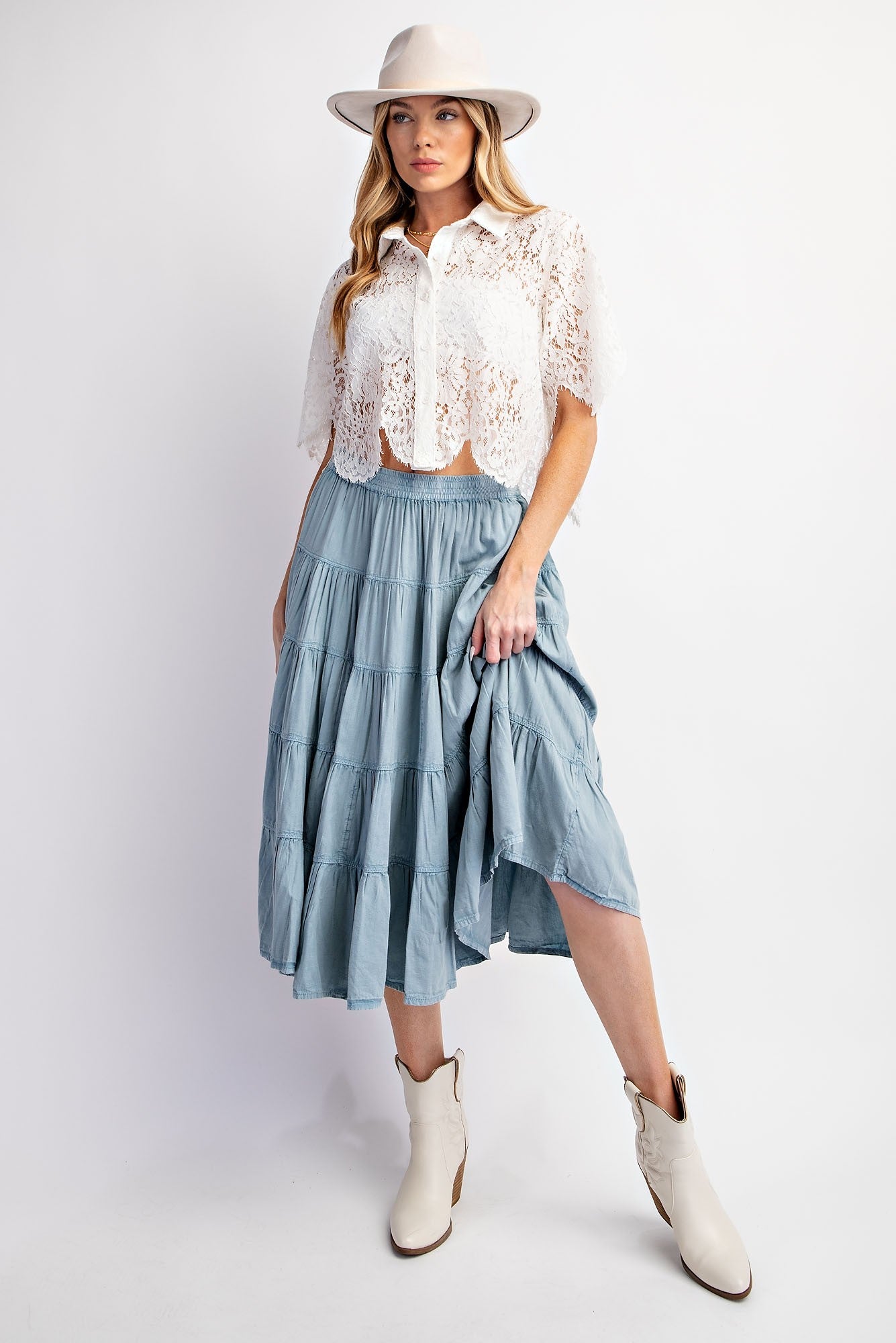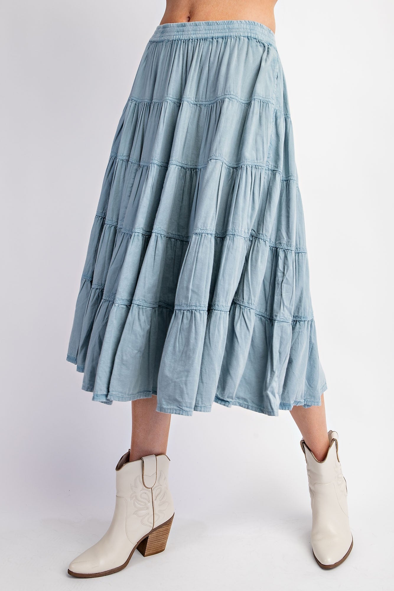 Effortlessly chic and comfortable, this tiered ruffle skirt features a soft, medium-weight washed cotton that feels as good as it looks. The high waist with hidden elastic keeps everything in place while the layered ruffles add playful movement and dimension. Perfect for casual days or dressed-up occasions.
