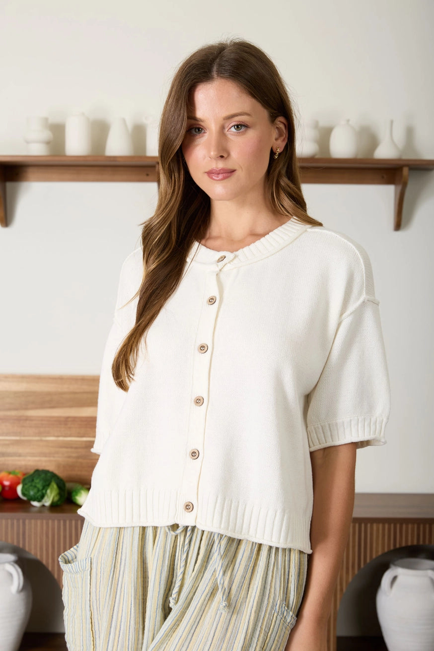 Effortless layering meets modern edge with this versatile cardigan. Featuring a classic round neckline and short sleeves, it buttons down the front for easy styling. The standout exposed seam detailing and raw edge trim create an intentional, contemporary look that works equally well over basics or dresses. A wardrobe essential with understated sophistication.