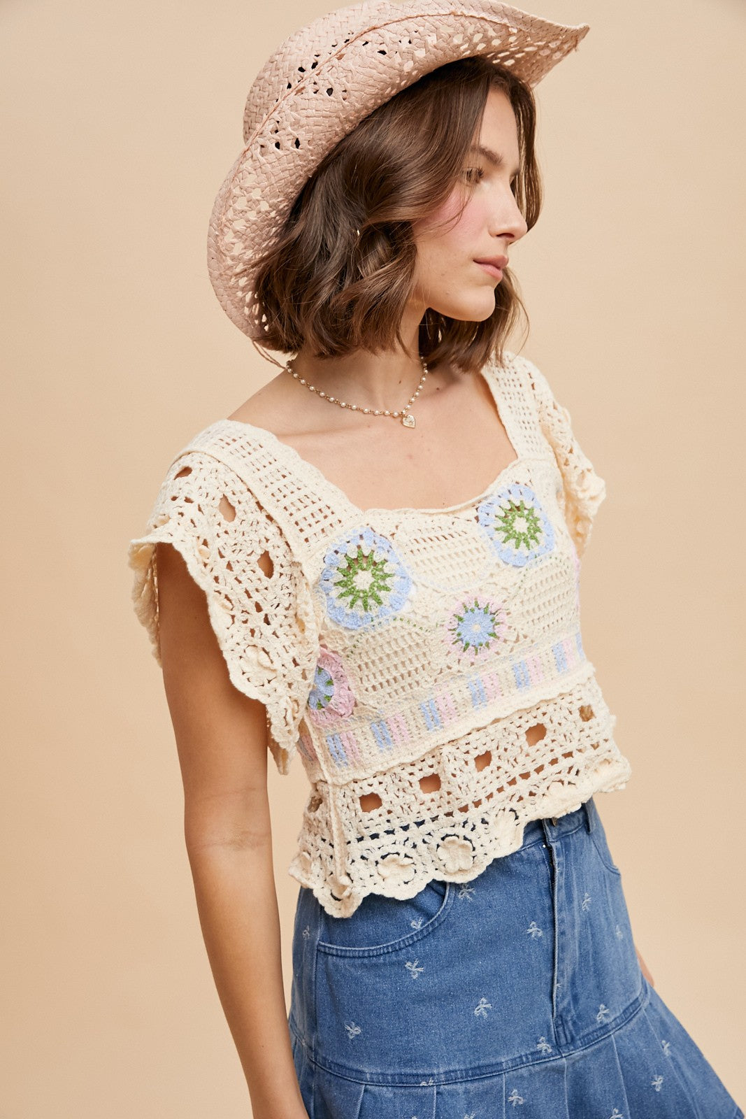 Elevate your casual wardrobe with this breezy crochet tank that's giving major summer vibes. The multi-textured crochet construction creates beautiful visual interest, while delicate ruffle sleeves add a playful feminine touch. A chic square neckline and cropped silhouette keep things modern and flattering, and the relaxed fit ensures all-day comfort. Perfect for pairing with your favorite denim or linen pants for effortless, on-trend style.