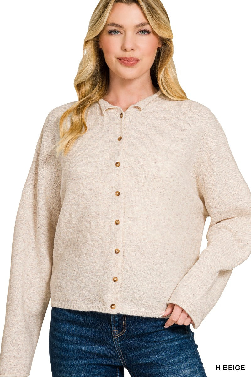 Elevate your everyday style with this timeless button-front cardigan crafted from a luxurious wool blend. Perfect for layering over your favorite tees or dresses, it offers warmth without the bulk. The classic collared design and structured fit make it a versatile wardrobe essential that transitions seamlessly from casual to polished. Cozy comfort meets effortless sophistication.
