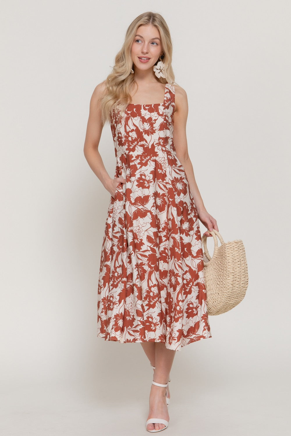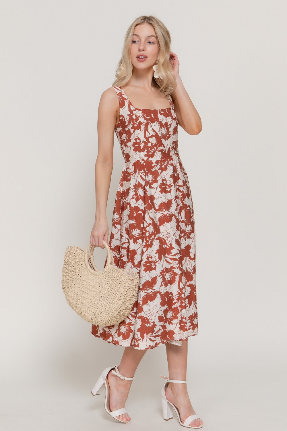 Elevate your wardrobe with this charming Garden Party Floral Dress in warm taupe and brown tones. Featuring a flattering square neckline and midi length silhouette, this piece offers timeless elegance for any occasion. Adjustable straps ensure a customized fit, while the smocked back detail adds texture and visual interest. 90% rayon/10% nylon.
