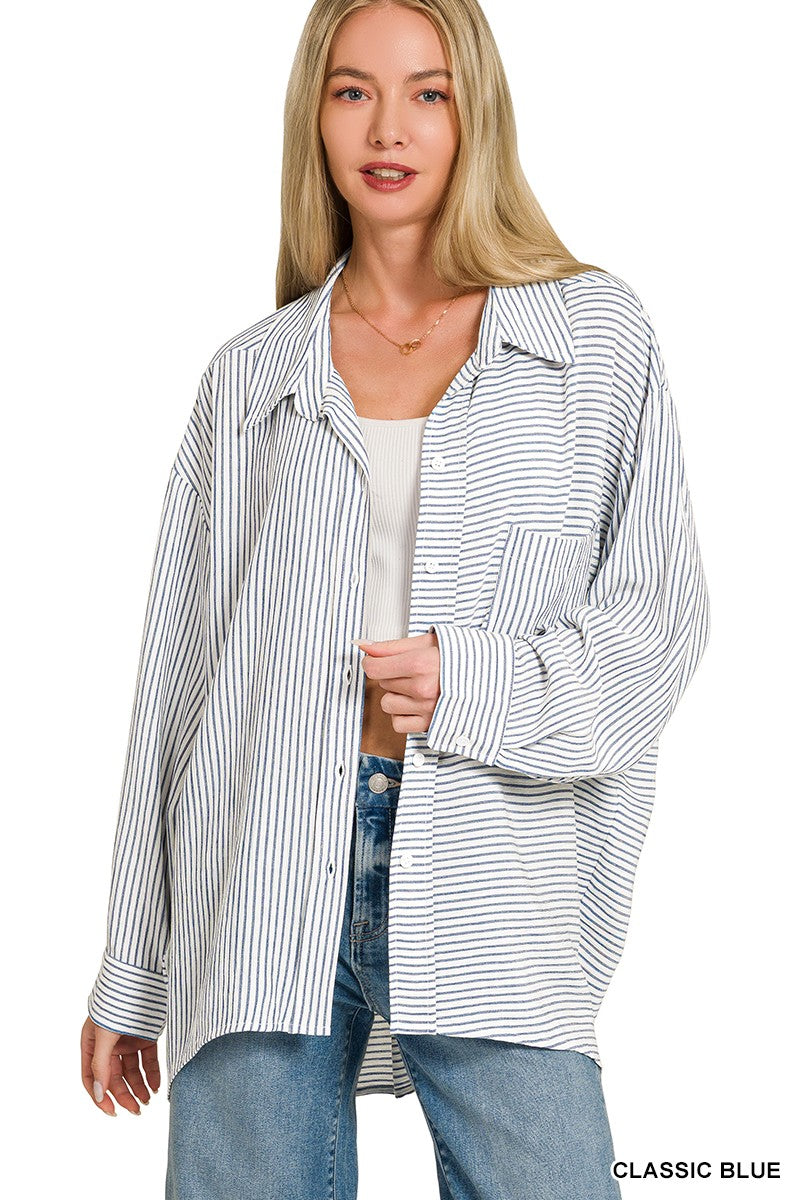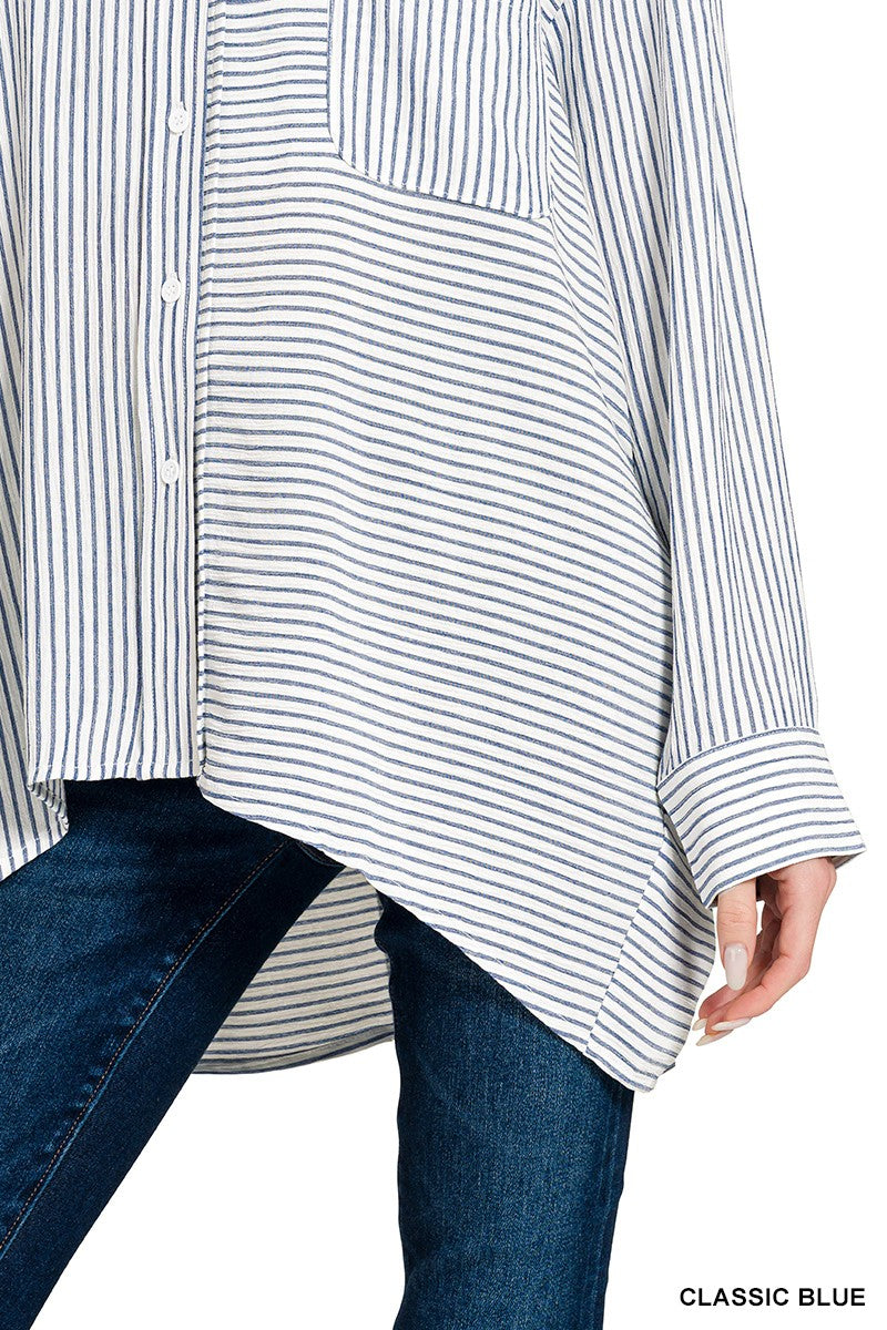 Effortless style meets comfort in this ocean blue striped button-down. The curved hi-low hem adds modern flair while the woven fabric drapes beautifully. Perfect for layering or wearing solo, this versatile blouse transitions seamlessly from office to weekend. A wardrobe essential that works harder than it looks.