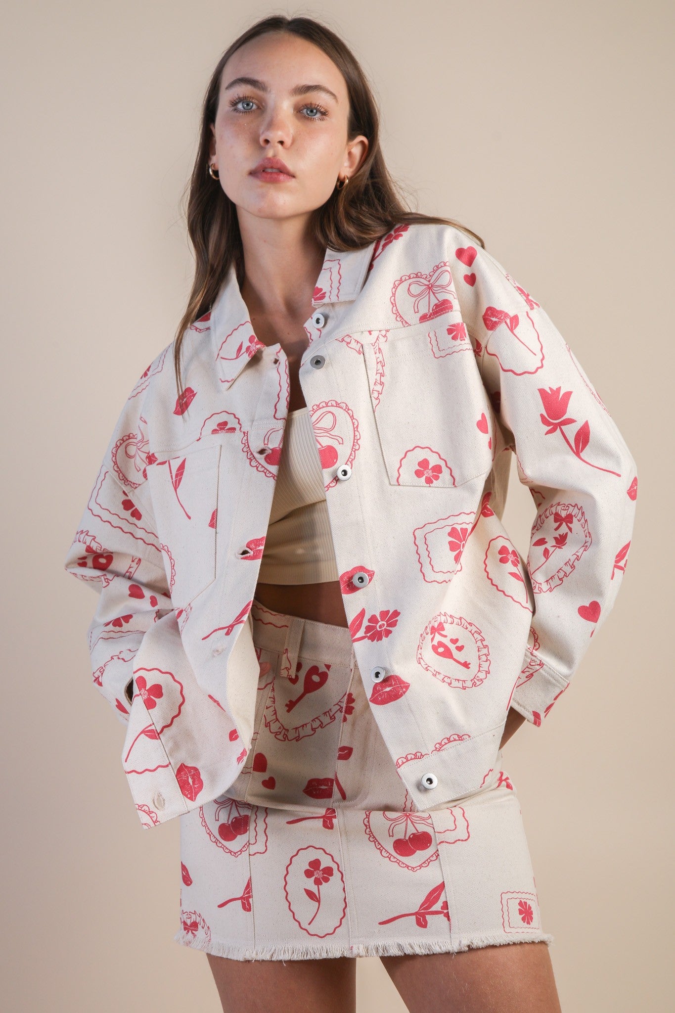 Effortlessly chic meets playful style with this ivory denim shacket featuring an adorable coquette print. The relaxed fit drapes beautifully over any outfit, while convenient button-front closure makes layering a breeze. Perfect for casual days or dressed-up moments, this versatile piece brings a touch of whimsy to your wardrobe. Layer it over basics, dresses, or tees for endless styling possibilities that feel fresh and fun.