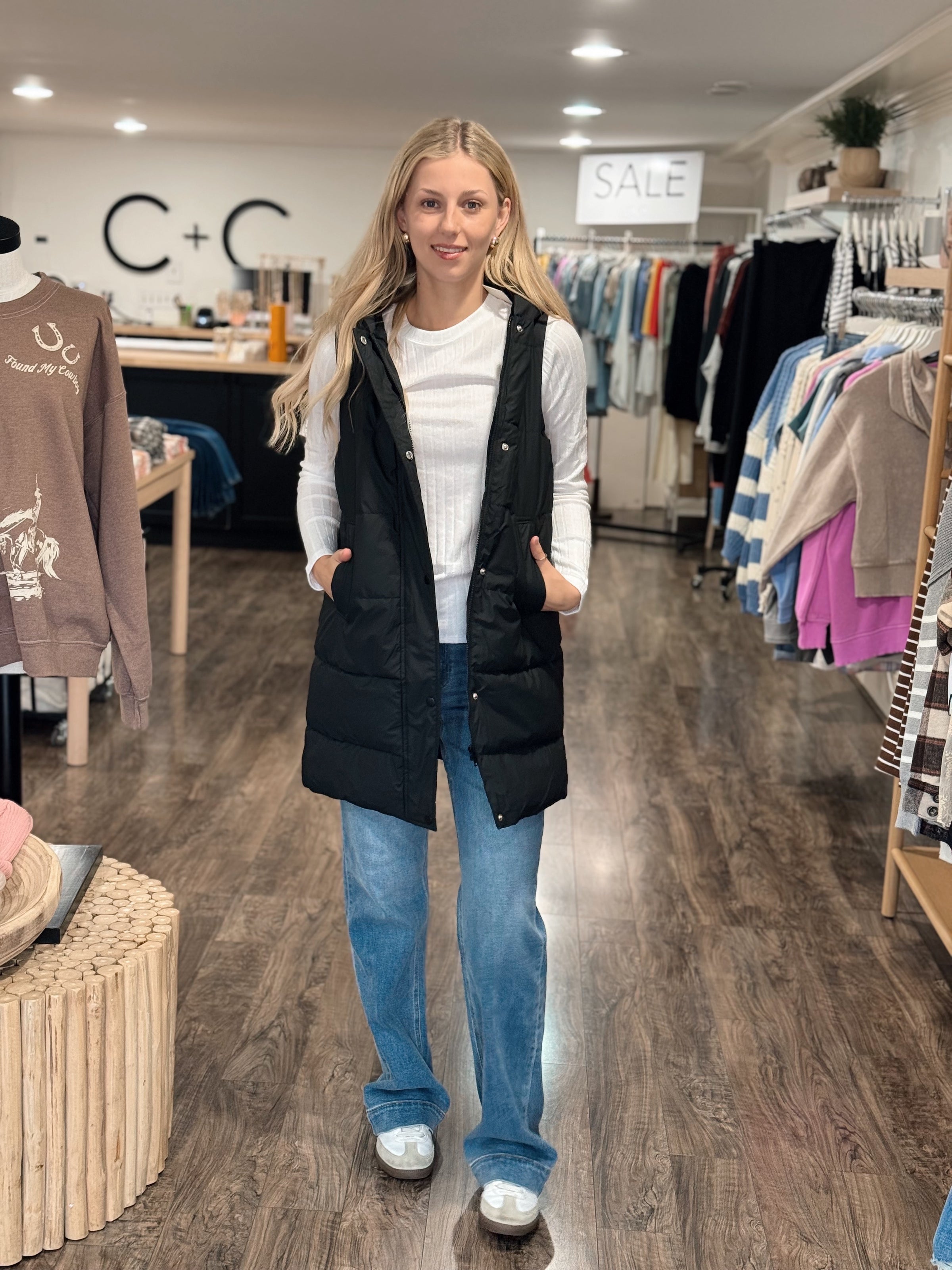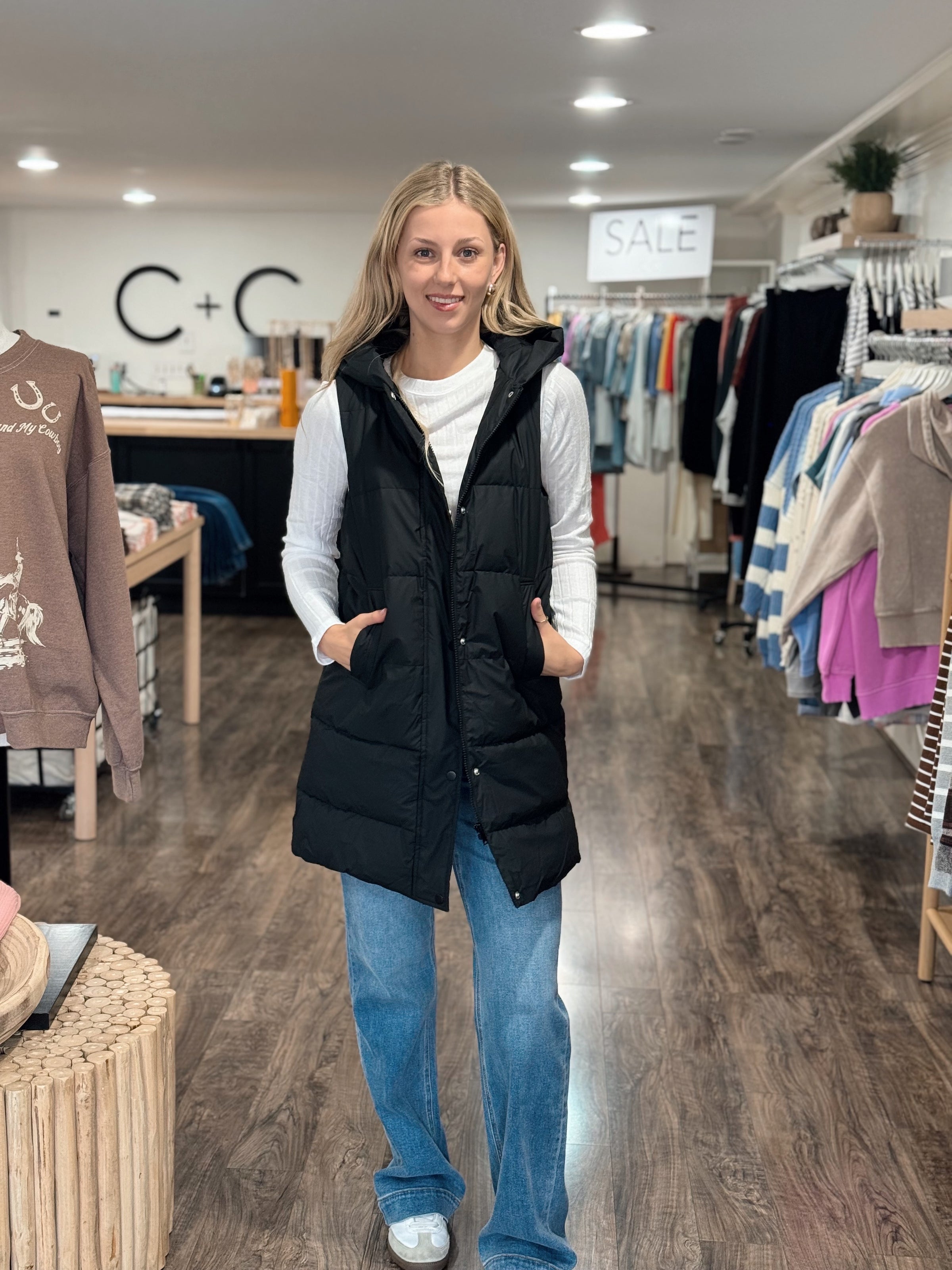 Stay cozy and dry with the Fan Favorite Puffer Vest, featuring a zip and snap front, convenient side pockets, and a protective hood. Its water-resistant design makes it perfect for unpredictable weather. Available in three versatile colors to match any outfit.