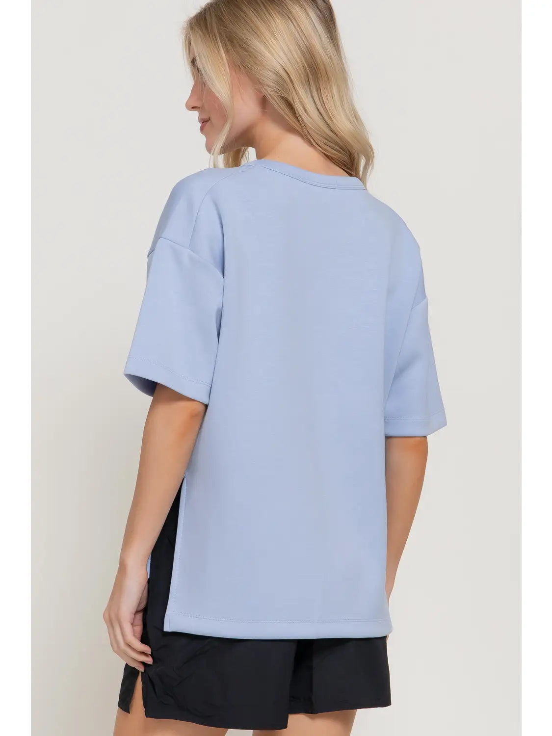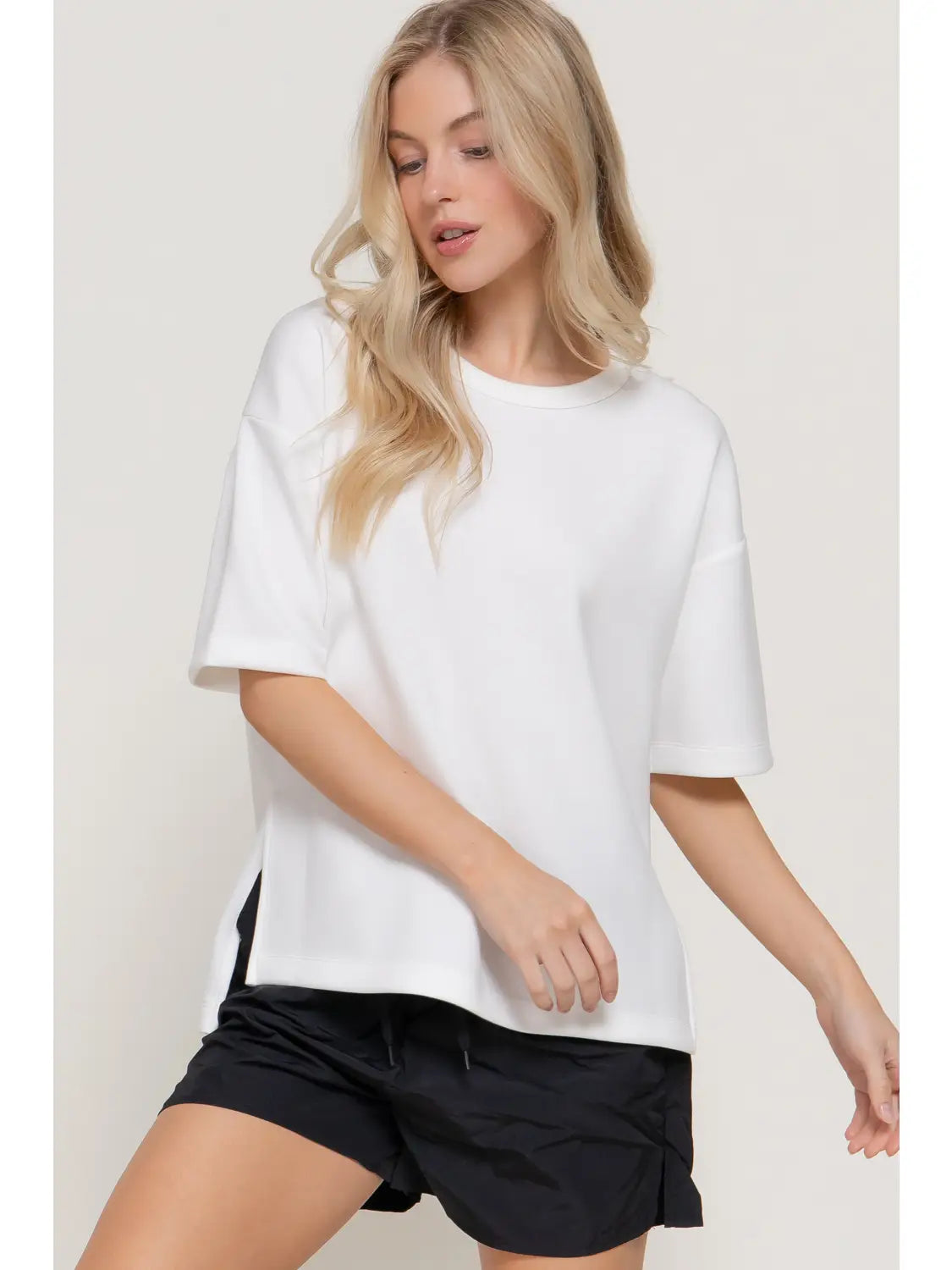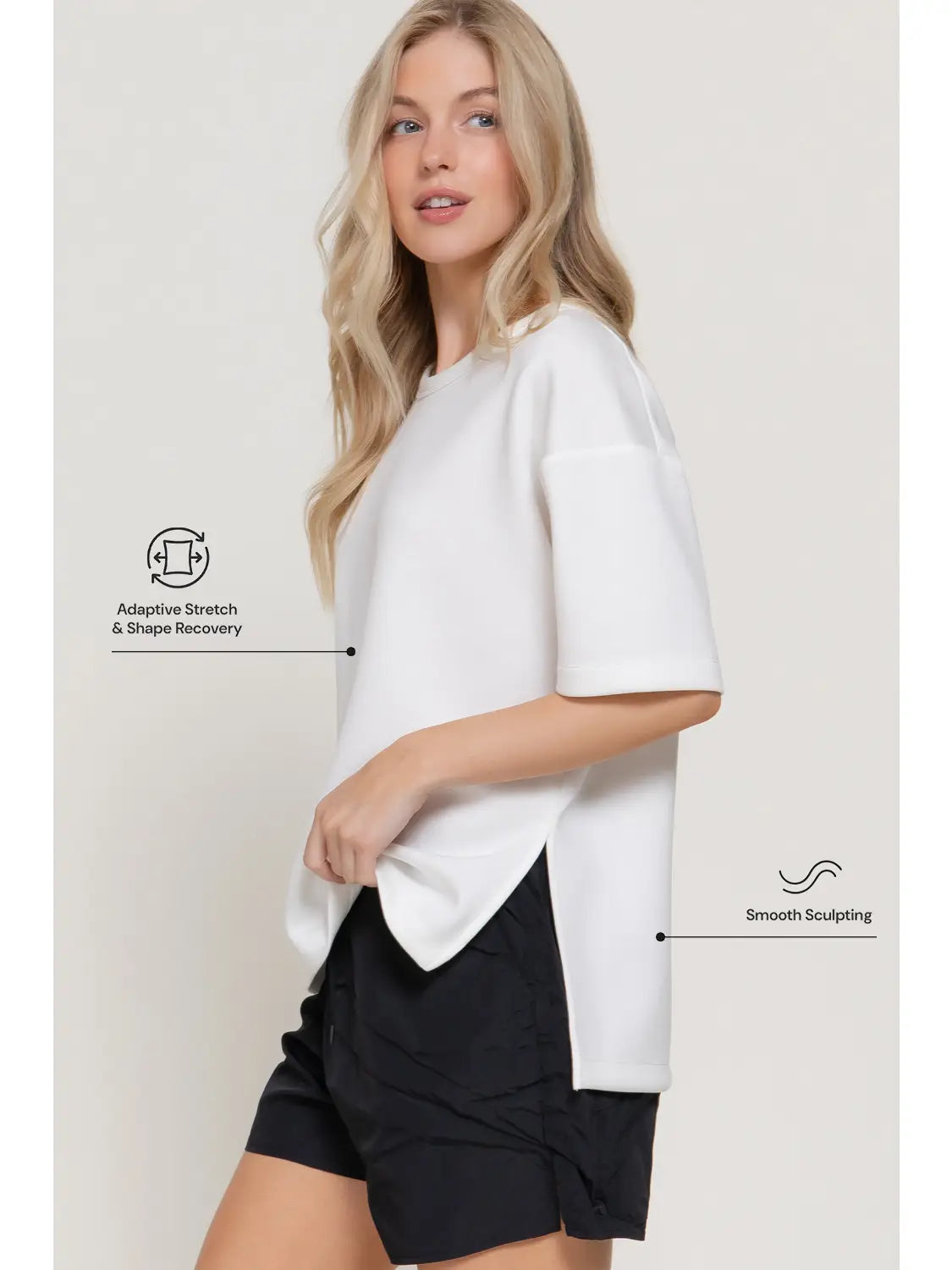 Effortlessly chic and oh-so-comfy, this oversized scuba knit top is your new go-to piece. The soft modal blend drapes beautifully while the spandex keeps everything in place, giving you that perfect balance of stretch and structure. Short sleeves and a classic round neck make it endlessly versatile—dress it up or down for instant style. Whether you're running errands or catching up with friends, this cozy essential works for every vibe.