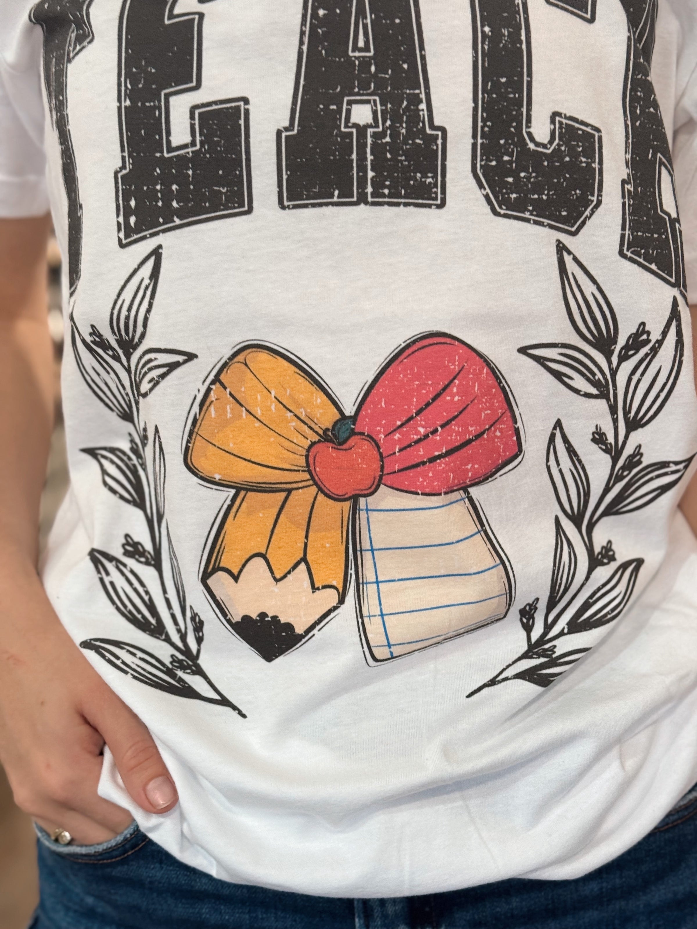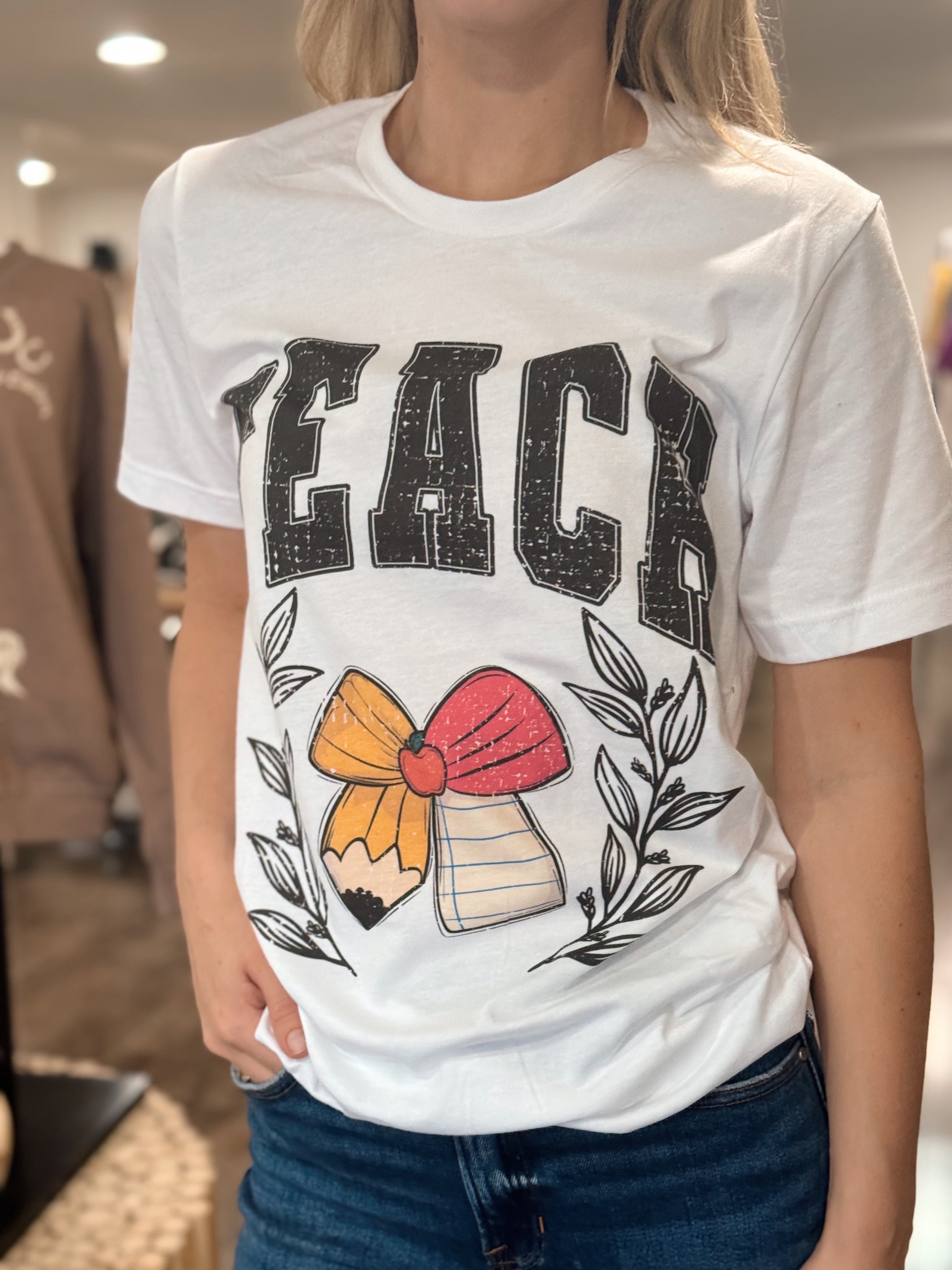 This Teach Graphic Tee in white features a classic fit and unisex sizing for comfortable wear. Made from pre-shrunk 100% cotton, it offers durability and a soft feel wash after wash. Perfect for everyday casual style.
