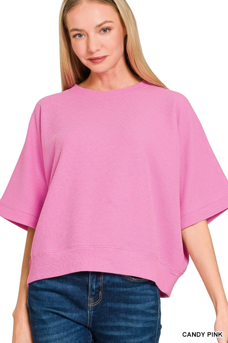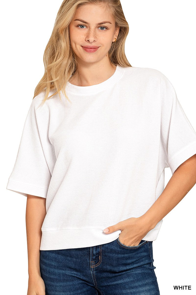 Elevate your casual wardrobe with this playful ribbed tee that's perfect for everyday style. Crafted from soft double knit fabric, it offers comfort and durability with a flattering fit. The banded bottom keeps everything in place while the short sleeves make it ideal for layering or wearing solo. Available in two gorgeous colors, this versatile piece transitions seamlessly from weekend hangouts to casual outings. A fun, modern essential that works with everything in your closet. 66% poly/32% cotton/2% spandex.