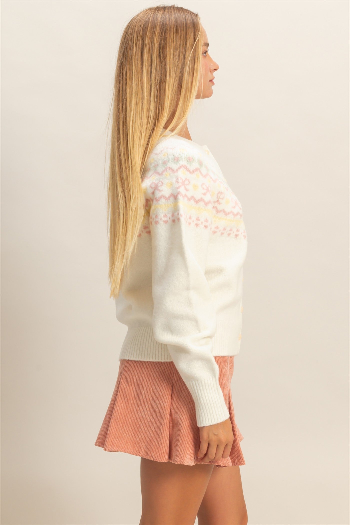 Cozy up in timeless style with this Fair Isle Button Front Cardigan! Featuring a charming fair isle knit pattern in soft, touchable fabric, this classic piece layers beautifully over your favorite tees and dresses. The button front closure and relaxed classic fit make it effortlessly versatile—perfect for casual coffee runs or weekend hangouts. Whether you're channeling vintage vibes or modern minimalism, this ivory cardigan is your new go-to for that perfectly put-together look.
